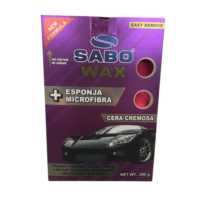 Cera en pasta SABO de 200 gramos que protege y da brillo a la pintura del auto. Fórmula cremosa fácil de aplicar y de larga duración.
