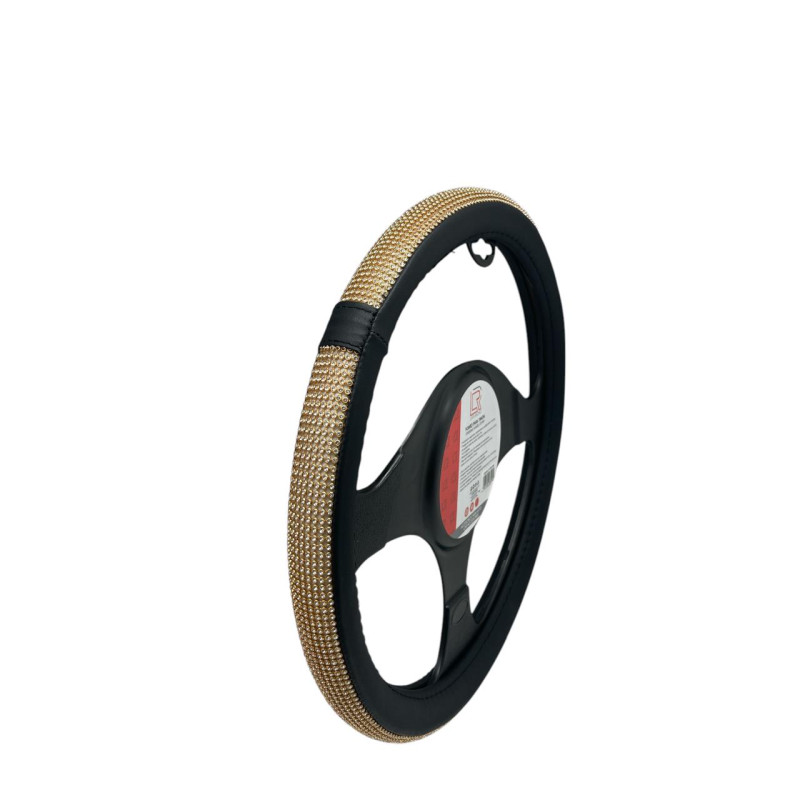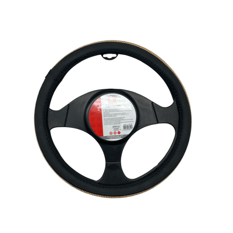 Forro para volante LAFA con diseño negro y detalles dorados tipo diamante. Mejora el agarre y estilo de tu vehículo con un acabado elegante y cómodo.