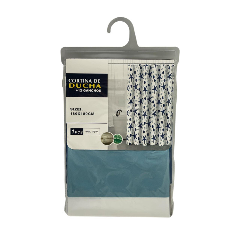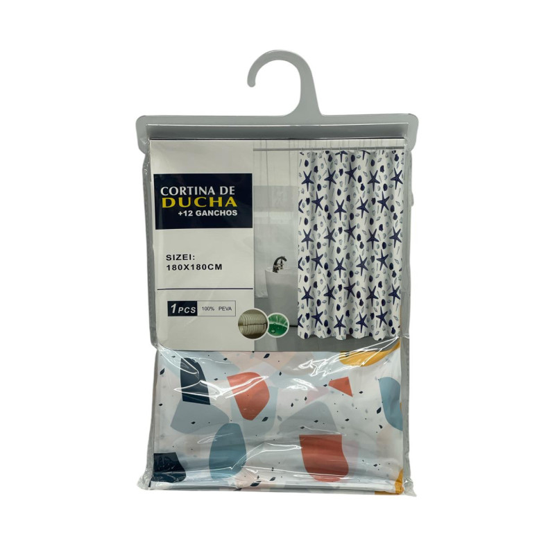 Cortina de baño fabricada en material plástico resistente al agua, diseñada para uso diario. Su tamaño estándar permite una cobertura adecuada en la mayoría de duchas y tinas, ayudando a mantener el baño ordenado y funcional.