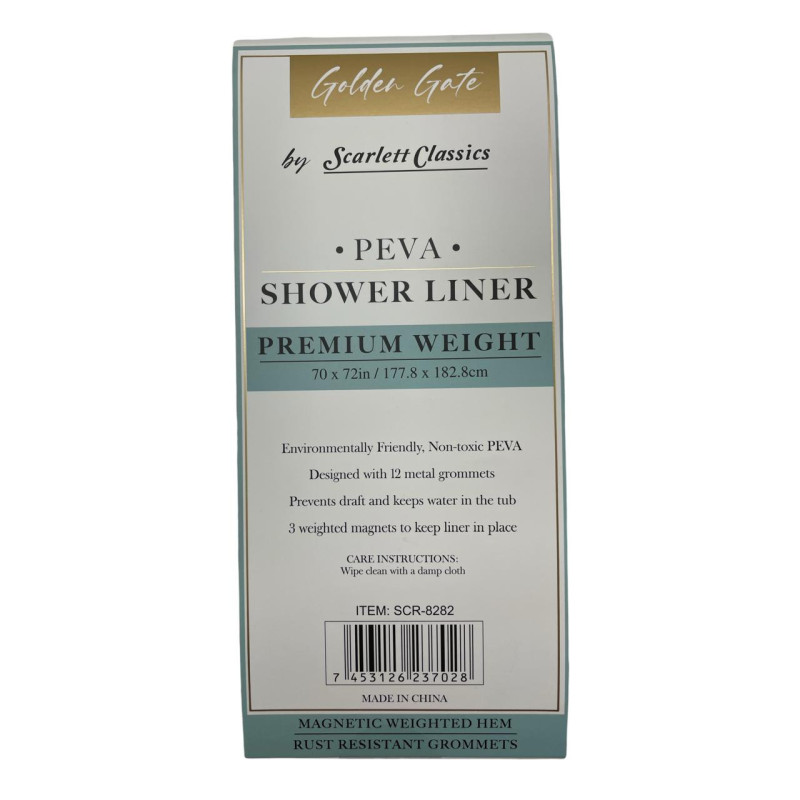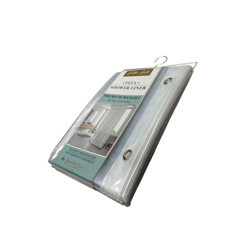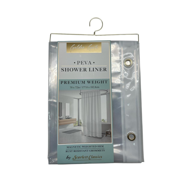 Cortina de baño fabricada en material resistente al agua, diseñada para uso diario. Incluye aros integrados que facilitan una instalación rápida en la mayoría de barras estándar.
