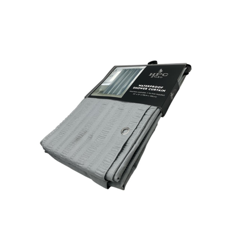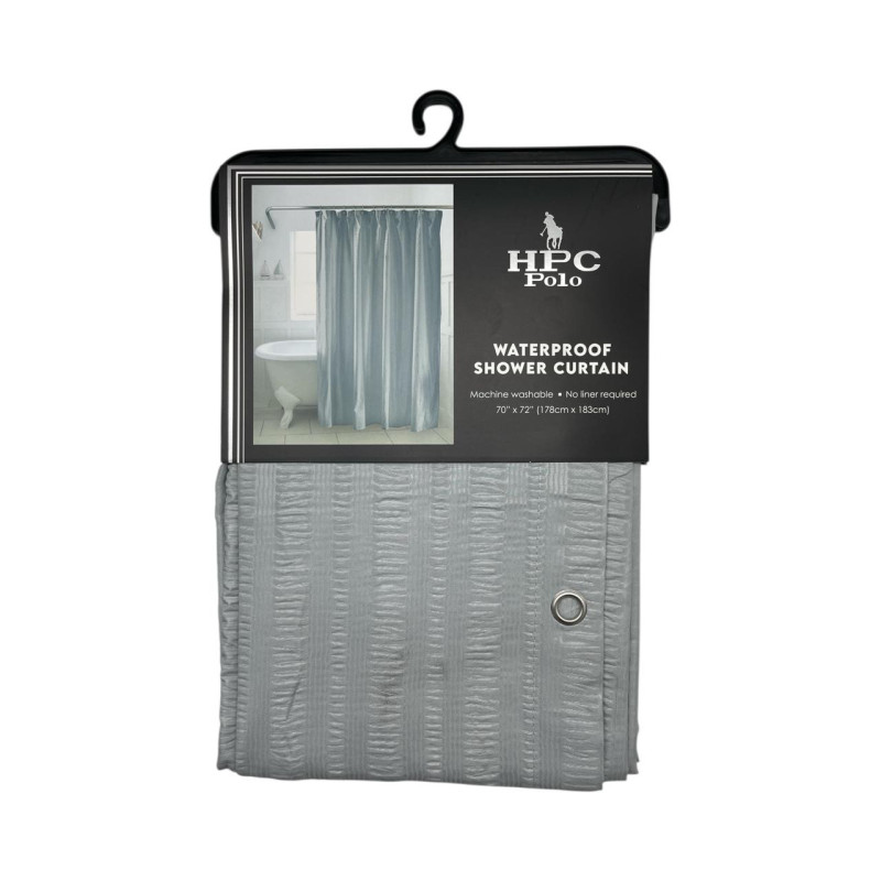 Cortina de baño en color gris, diseñada para brindar privacidad y evitar salpicaduras. Su tamaño estándar permite una instalación sencilla en la mayoría de duchas.
