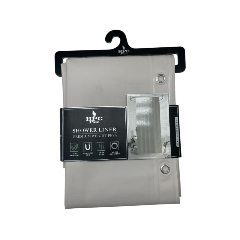 Cortina de baño diseñada para evitar salpicaduras de agua fuera de la ducha. Incluye 12 ganchos para una instalación inmediata. Su tamaño estándar se adapta a la mayoría de duchas y bañeras.