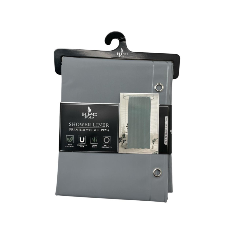 Cortina de baño fabricada en material resistente al agua, diseñada para uso diario. Incluye 12 ganchos que facilitan su instalación en la mayoría de barras estándar. Su tamaño cubre completamente la zona de ducha o tina.