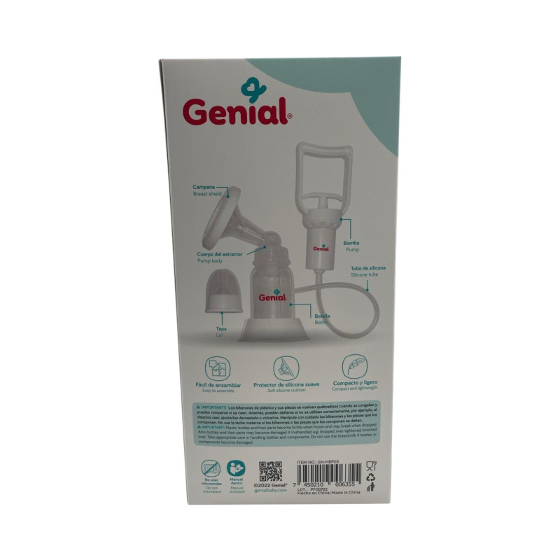 El Extractor de Leche Manual GENIAL FlowControl™ está diseñado para ofrecer una experiencia de lactancia práctica y sin complicaciones. Su sistema de succión ajustable imita el ritmo natural de succión del bebé, permitiendo un flujo constante y controlado. Cuenta con un mango ergonómico que reduce la fatiga durante el uso y una copa de silicón suave que se adapta cómodamente al pecho. Fabricado con materiales libres de BPA, es ideal para madres que buscan practicidad, higiene y control durante la extracción.