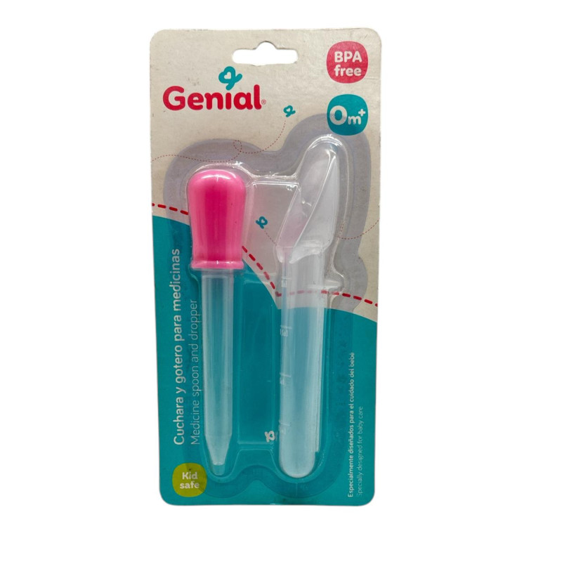 Set de gotero y cuchara medidora Genial, ideal para administrar medicamentos o suplementos al bebé de manera segura y precisa.
