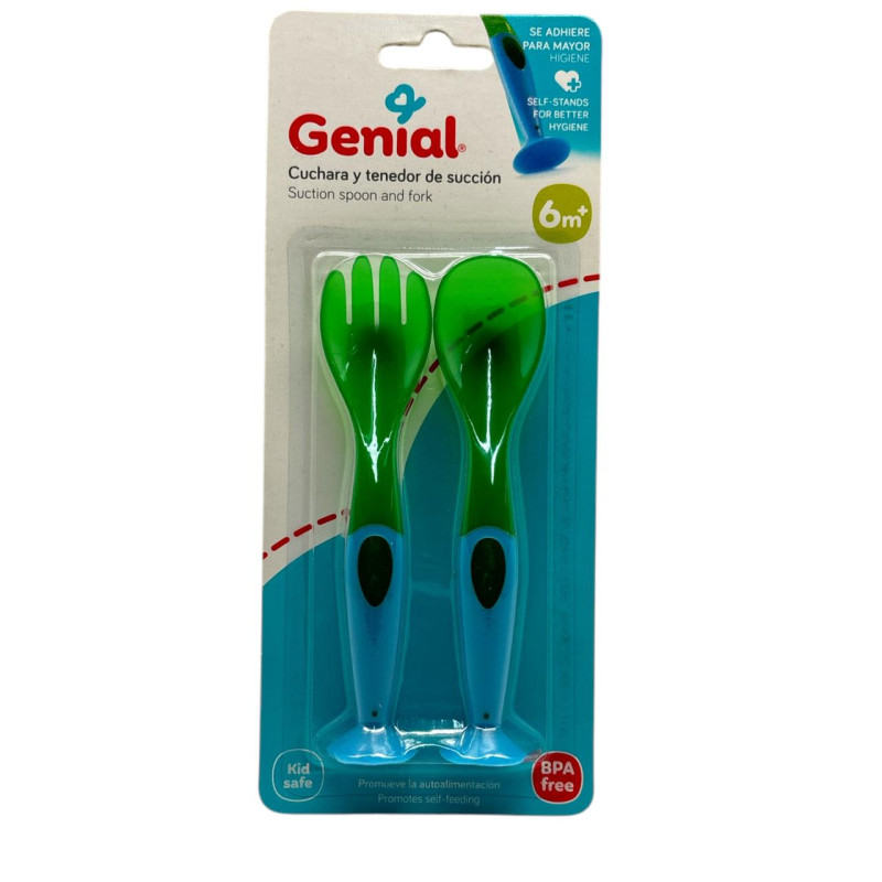 El set de cuchara y tenedor con succión Genial es ideal para acompañar la etapa de aprendizaje del bebé en la alimentación. Su base con ventosa permite adherir los utensilios a la superficie, evitando que se caigan o ensucien. Fabricados con silicón suave de grado alimenticio, son seguros para las encías y los primeros dientes. Su diseño ergonómico se adapta perfectamente a las manos pequeñas del bebé, fomentando la independencia y coordinación motora. Colores llamativos que estimulan la curiosidad y hacen más divertida la hora de comer.