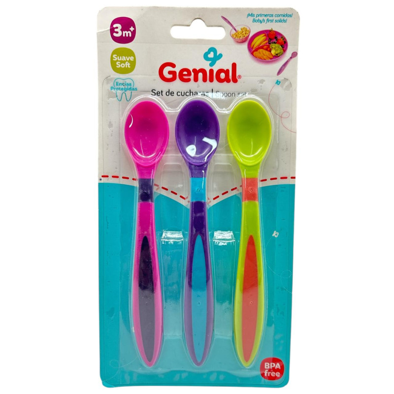 El set de cucharas para bebé Genial incluye 3 piezas ideales para acompañar la etapa de alimentación del pequeño. Están fabricadas con materiales suaves y seguros para no dañar las encías ni los dientes del bebé. Su mango ergonómico permite un agarre cómodo tanto para los padres como para el niño cuando empieza a alimentarse solo. Perfectas para comidas calientes o frías, son resistentes, duraderas y fáciles de limpiar. Colores surtidos que hacen más divertida la hora de comer.