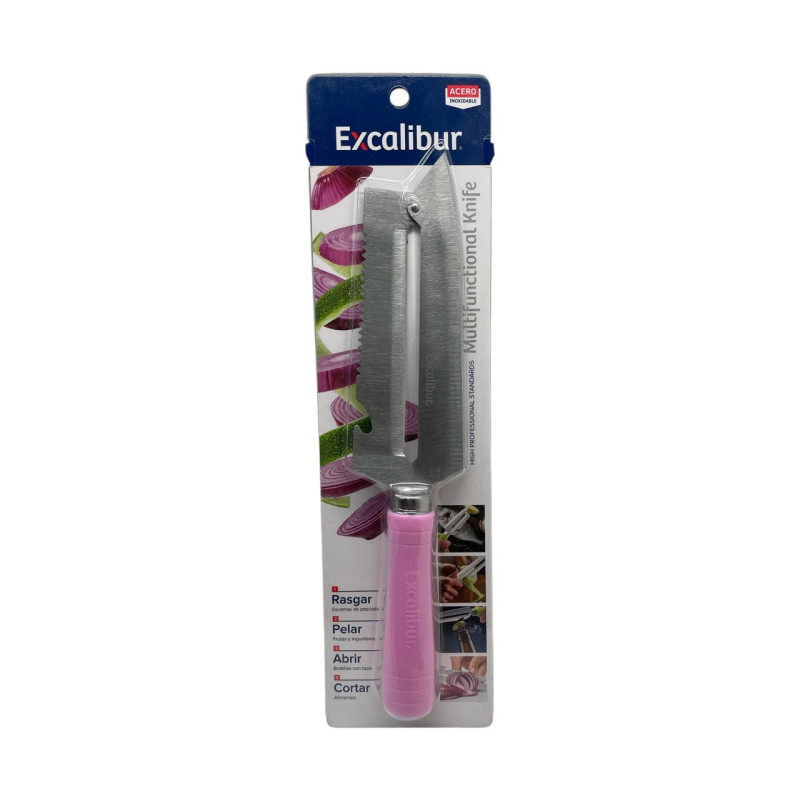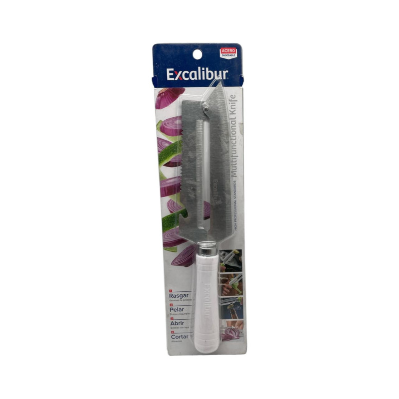 Este cuchillo Excalibur combina diseño ergonómico y hoja doble de acero inoxidable que facilita cortes más rápidos y uniformes. Perfecto para uso doméstico o profesional.