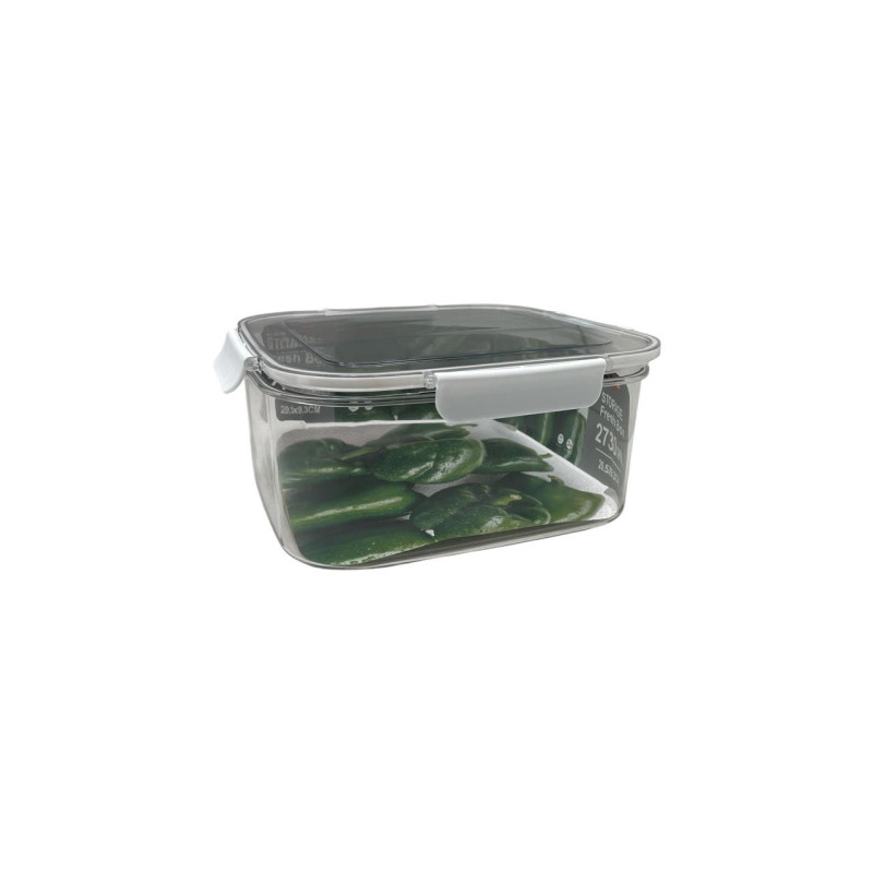 Envase plástico cuadrado de alta capacidad, diseñado para el almacenamiento de alimentos sólidos o líquidos. Su forma facilita el apilado y optimiza el espacio en refrigeradora o despensa, siendo una solución práctica para el uso diario.