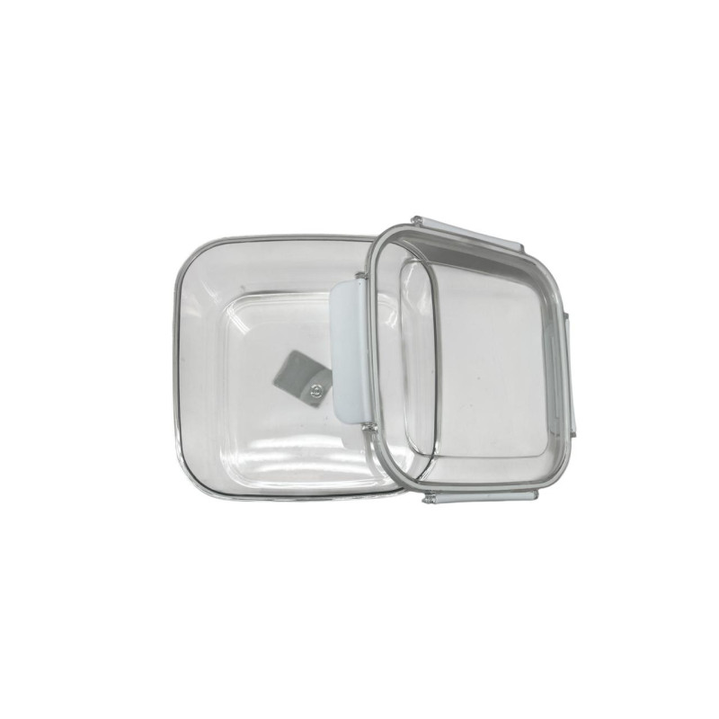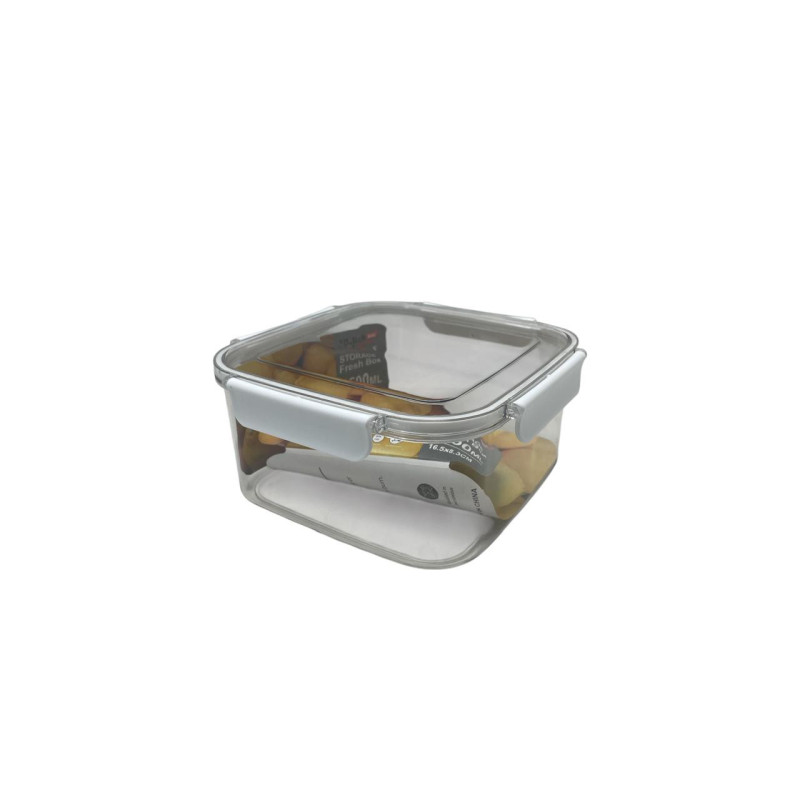 Envase plástico cuadrado de tamaño mediano, diseñado para el almacenamiento de alimentos sólidos o líquidos. Su forma cuadrada permite un apilado eficiente y un mejor aprovechamiento del espacio, siendo ideal para el uso diario.