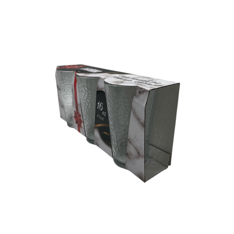 Este set incluye 3 vasos de vidrio con capacidad de 470 ml cada uno. Su diseño transparente combina con cualquier estilo de cocina y es ideal para uso diario en el hogar u oficina.
