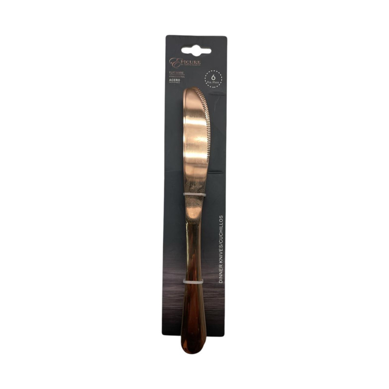 Set de seis cuchillos de mesa fabricados en metal resistente, diseñados para el uso diario en el hogar. Ideales para acompañar comidas cotidianas, reuniones familiares o como complemento básico de cubiertos.