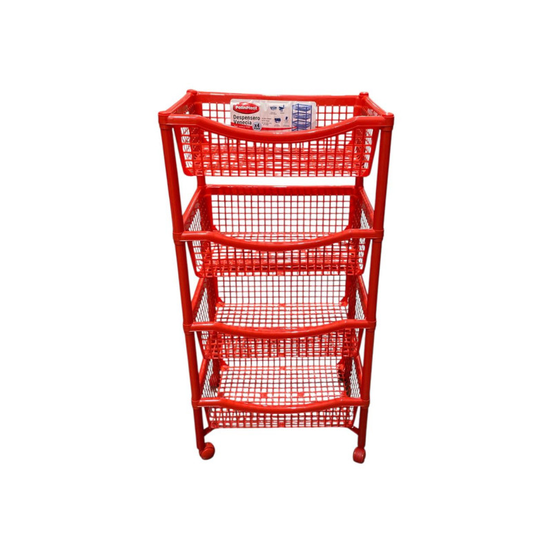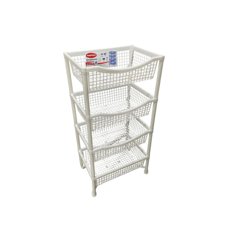 Organizador de 4 niveles fabricado en plástico resistente, diseñado para almacenar y ordenar productos de limpieza, baño, cocina u otros artículos del hogar. Su diseño vertical permite aprovechar mejor el espacio disponible y facilitar el acceso a cada nivel.