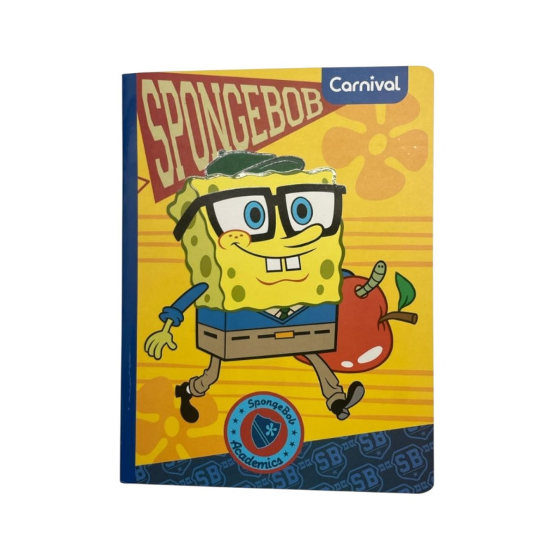 Cuaderno cosido de 100 hojas con portadas ilustradas de Bob Esponja, ideal para uso escolar diario.