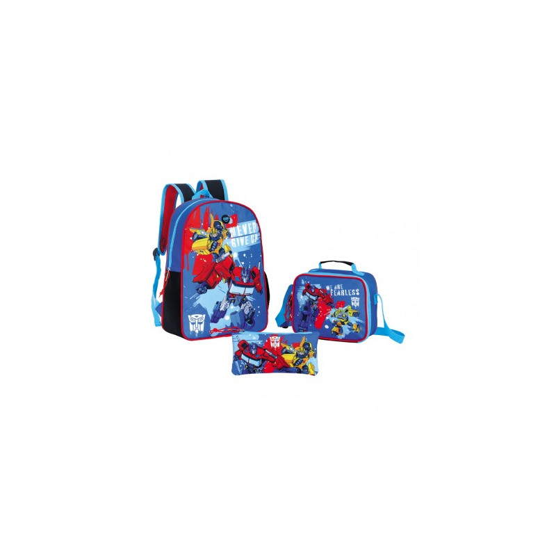 Set escolar inspirado en Transformers que incluye mochila espaciosa, lonchera térmica para alimentos y cartuchera para útiles. Diseñado para brindar comodidad, organización y durabilidad durante la jornada escolar.