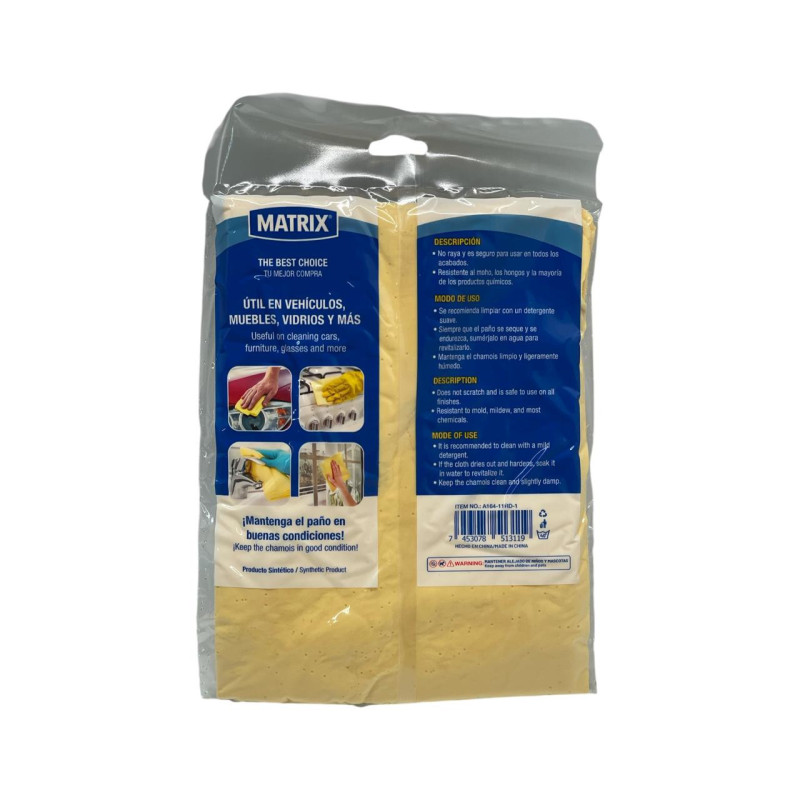 El Paño Chamois Matrix es el aliado perfecto para limpiar y secar tu vehículo, vidrios, espejos o superficies delicadas. Fabricado con material sintético de alta calidad, imita la textura del cuero natural, brindando excelente capacidad de absorción y resistencia al desgaste. Su diseño permite retener una gran cantidad de agua sin dejar residuos, logrando un acabado brillante y sin rayas. Es reutilizable, fácil de escurrir y mantener, convirtiéndose en una herramienta práctica tanto para uso automotriz como doméstico.