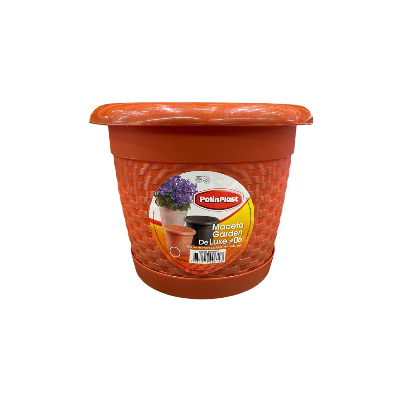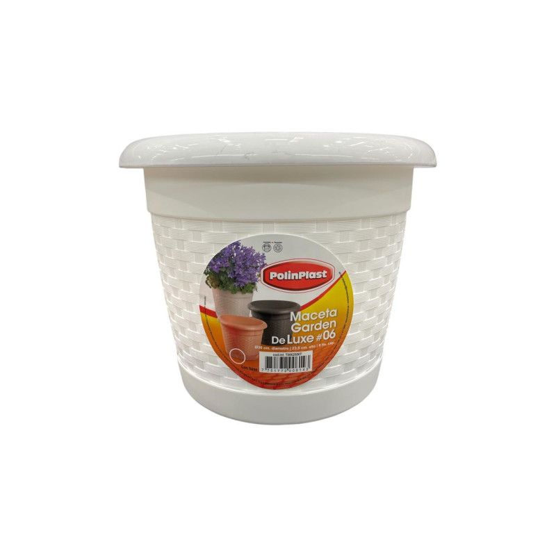 La maceta Poliplast con base Nº 6 combina diseño funcional con resistencia. Fabricada en plástico de alta calidad, es ligera, duradera y resistente a la intemperie, lo que la hace perfecta para uso interior o exterior. Su base integrada evita derrames de agua, manteniendo los espacios limpios y protegidos. Ideal para todo tipo de plantas ornamentales, hierbas o flores, aporta un toque natural y ordenado a tu jardín, balcón o sala.