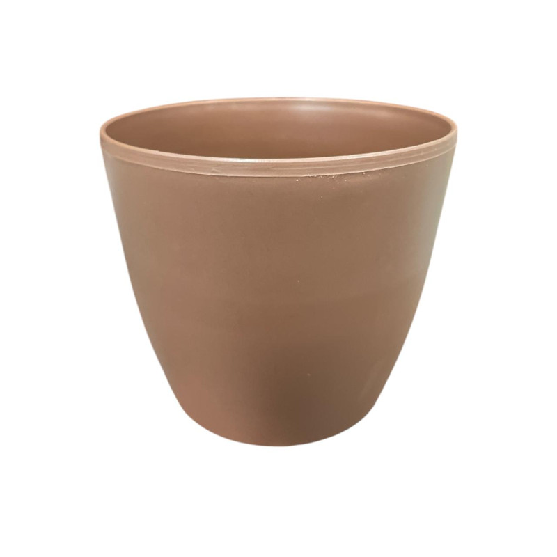 Maceta redonda alta color café, resistente, ligera y apta para exteriores e interiores. Diseño estable y práctico para plantas pequeñas y medianas.
