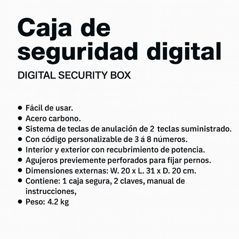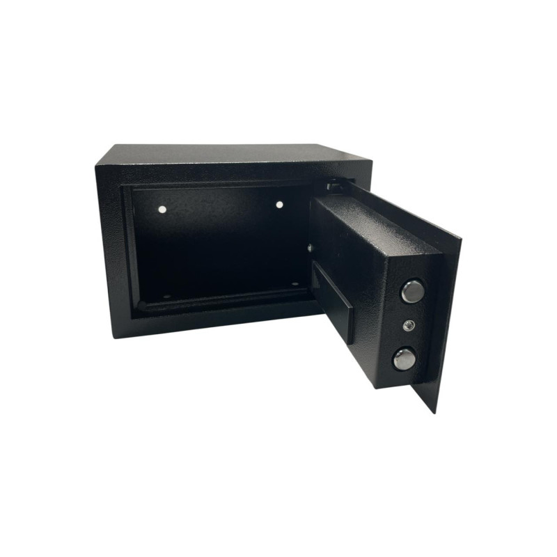 La caja fuerte Madison de acero es perfecta para resguardar documentos, efectivo, joyas y artículos de valor en el hogar u oficina. Con dimensiones de 31x20x20 cm, ofrece un tamaño práctico que se adapta a distintos espacios. Fabricada en acero de alta resistencia, brinda seguridad y confianza gracias a su cerradura mecánica confiable. Su acabado en negro mate le otorga un estilo elegante y discreto, integrándose fácilmente en cualquier entorno.