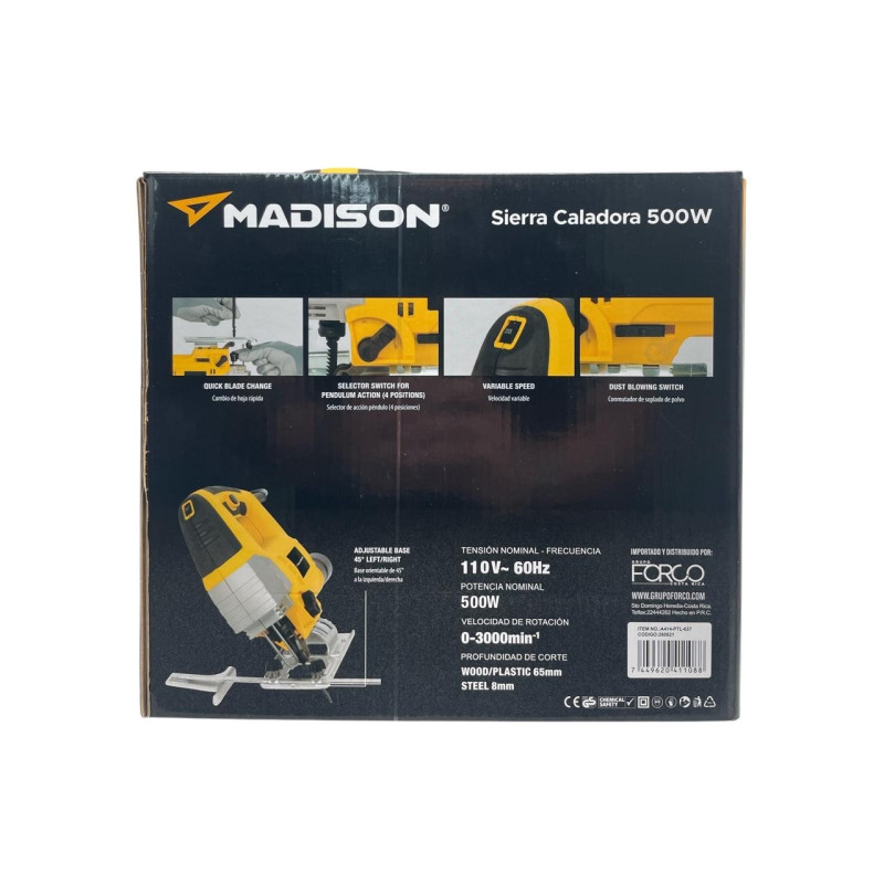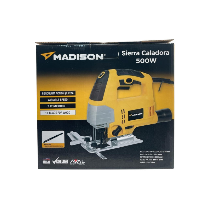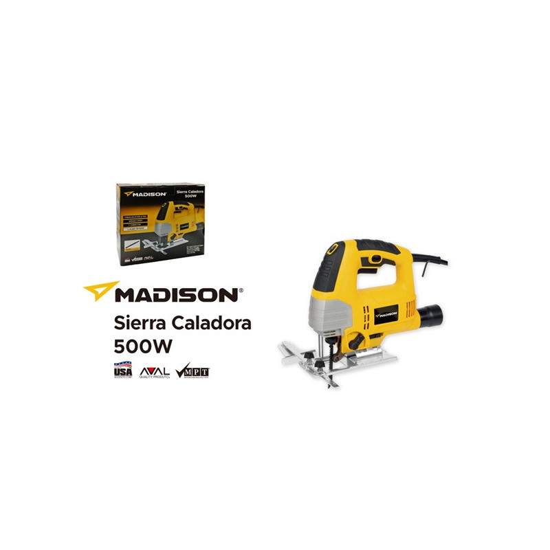 La Caladora Eléctrica Madison de 500W está diseñada para ofrecer cortes precisos y controlados en diversos materiales como madera, MDF y plásticos. Su motor potente permite trabajar con eficiencia, mientras que su diseño ergonómico facilita el manejo durante largas jornadas. Ideal para proyectos de bricolaje o carpintería doméstica.