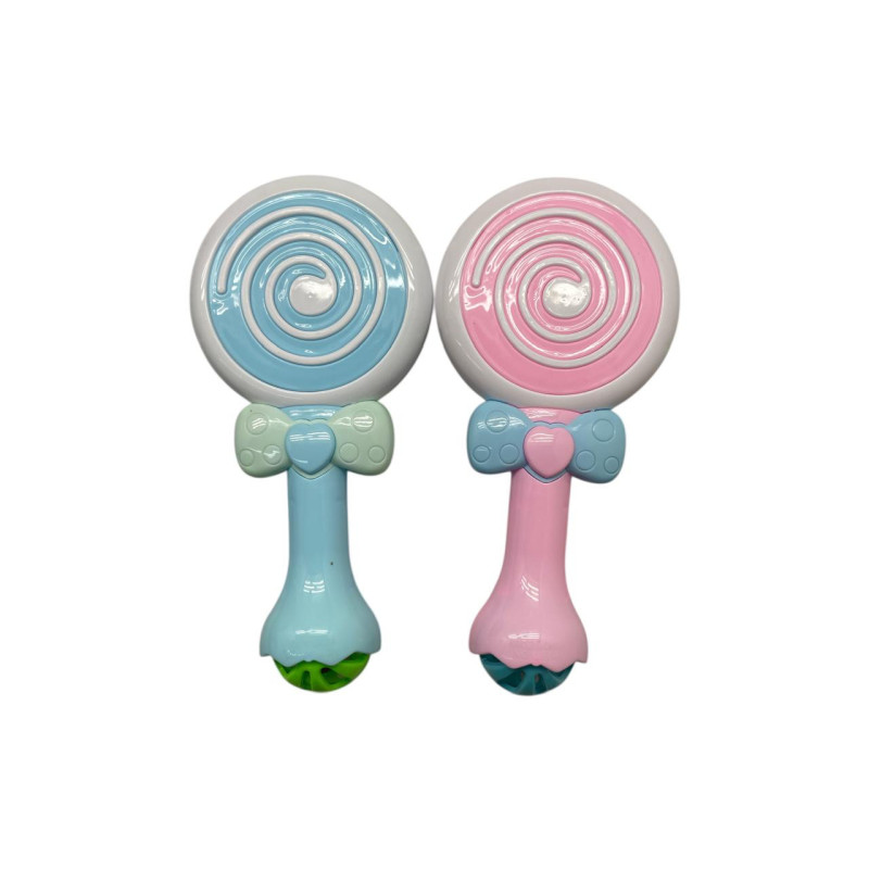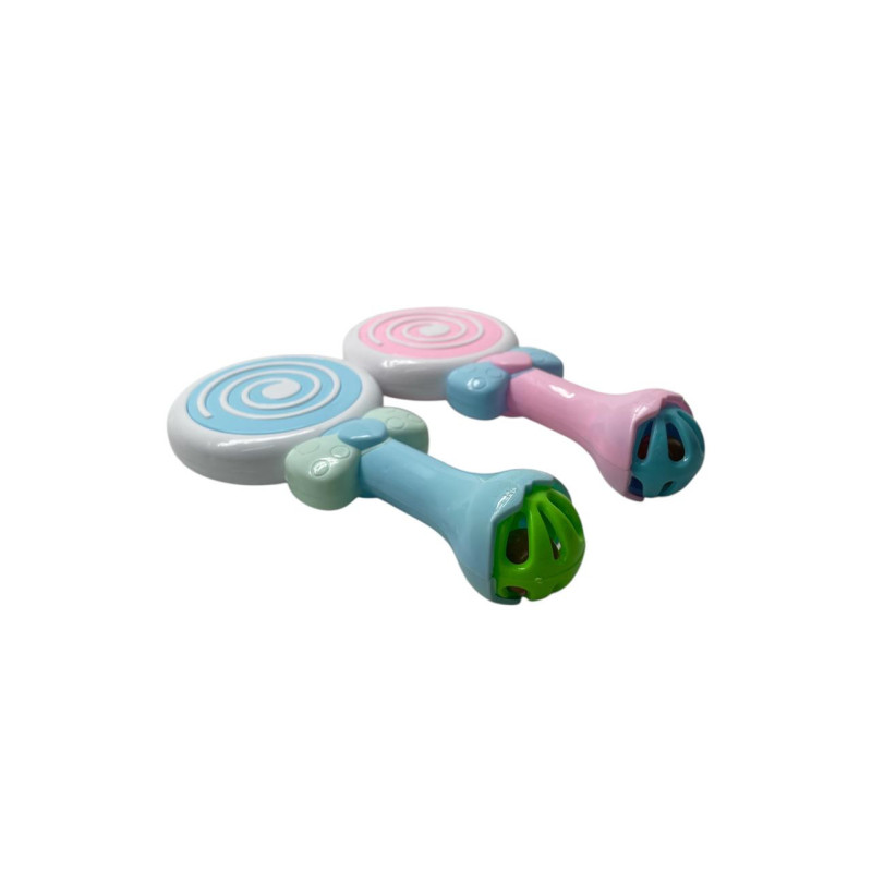 Sonajero infantil con diseño tipo piruleta, creado especialmente para manos pequeñas. Produce sonidos suaves al agitarlo, fomentando la estimulación auditiva, visual y táctil. Su forma ergonómica facilita el agarre y el juego seguro para bebés.