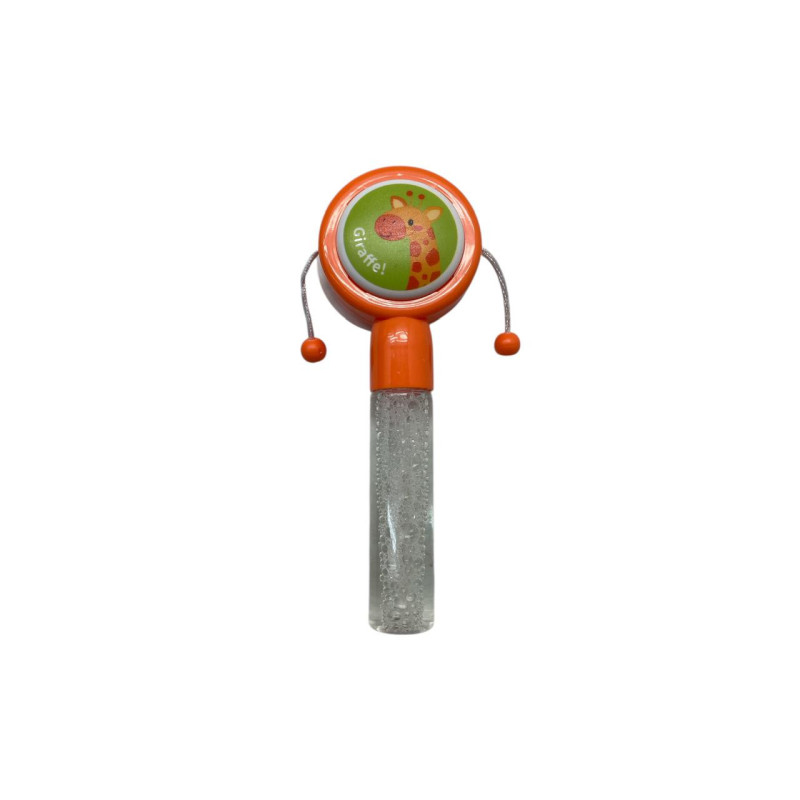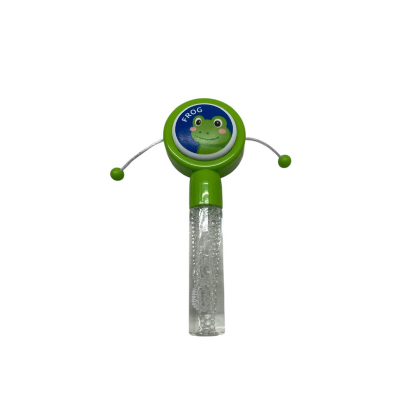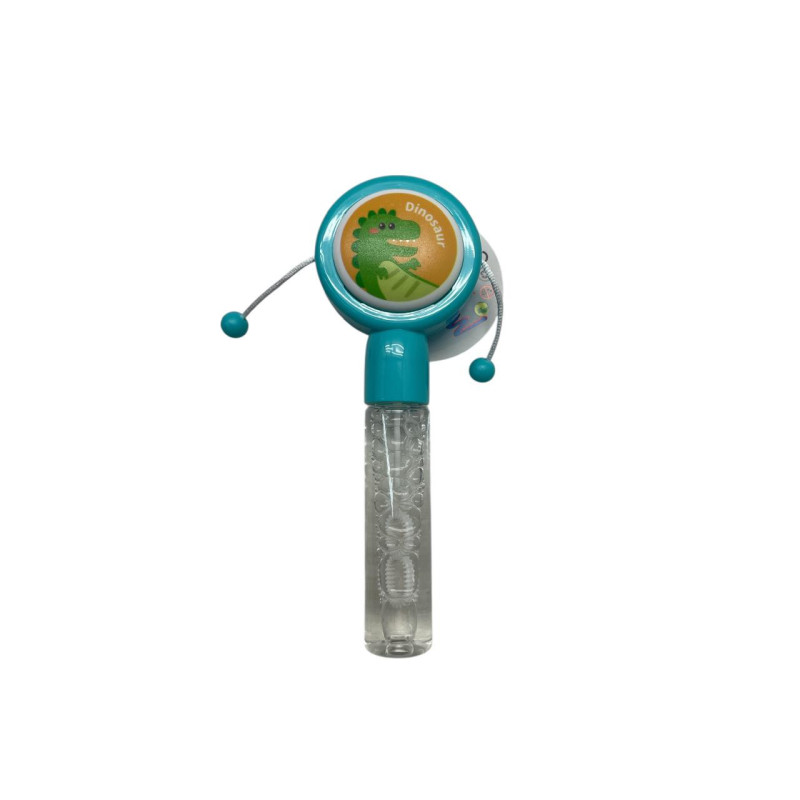 Juguete tipo tambor generador de burbujas con diseños de animales, ideal para juegos recreativos en exteriores como playa, parque o jardín.