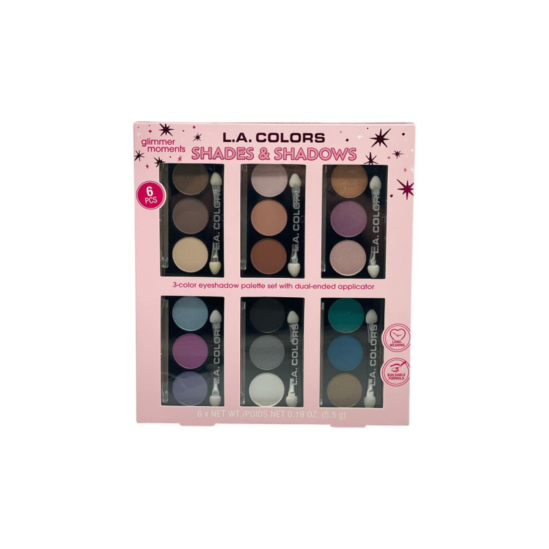 El set de sombras LA Colors incluye seis sombras distribuidas en tres tonos complementarios, pensadas para facilitar combinaciones sencillas y versátiles. Su textura suave permite una aplicación uniforme y es ideal tanto para uso diario como para ocasiones especiales.
