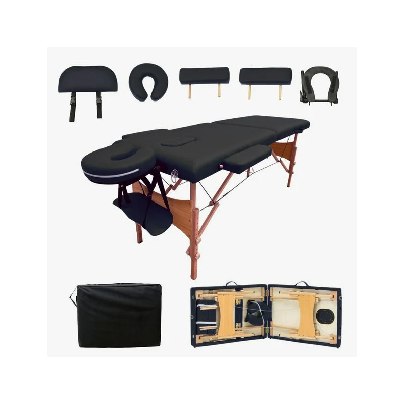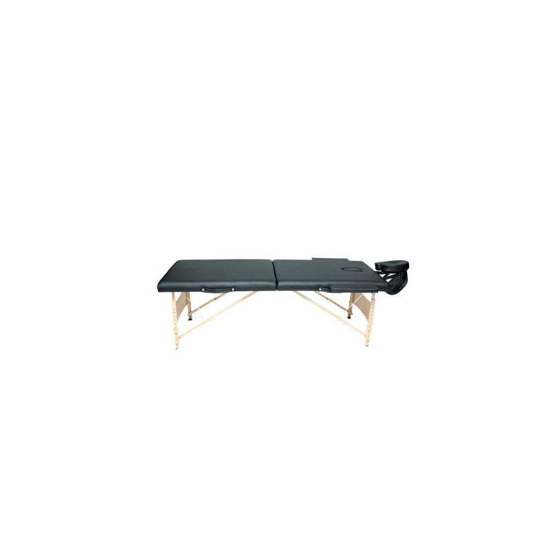 Cama Evok Anji-II en color negro, ideal para profesionales del bienestar. Altura y respaldo ajustables, superficie acolchada en vinil, estructura de madera sólida.
