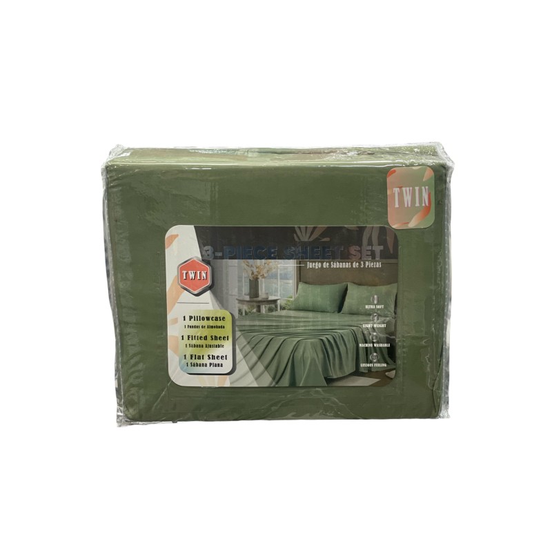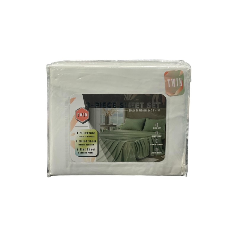 • Tamaño: Twin (individual); Piezas: 3; Uso: cama individual; Tela: poliéster/microfibra suave al tacto; Ligera y de secado rápido; Ajuste elástico en la sábana inferior.