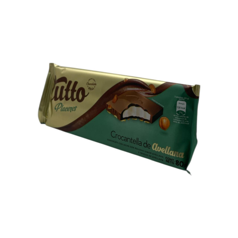 Chocolate Tutto Placer Avellana de 80 gramos, una deliciosa barra rellena con crema de avellana para disfrutar en cualquier momento. Ideal para los amantes del chocolate.
