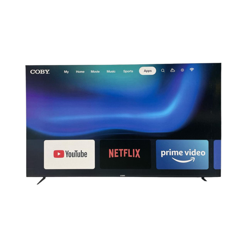 Pantalla Smart TV Coby de 65 pulgadas, ideal para disfrutar películas, deportes y streaming en una pantalla grande desde casa.