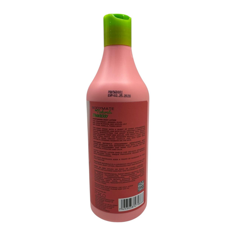 La loción corporal Bodymate con aroma a fresa está diseñada para brindar a tu piel una hidratación profunda y duradera. Su fórmula ligera de rápida absorción evita la sensación grasosa, dejando la piel suave y con un delicado aroma frutal. Ideal para el uso diario después de la ducha o en cualquier momento en que tu piel necesite frescura y nutrición.
