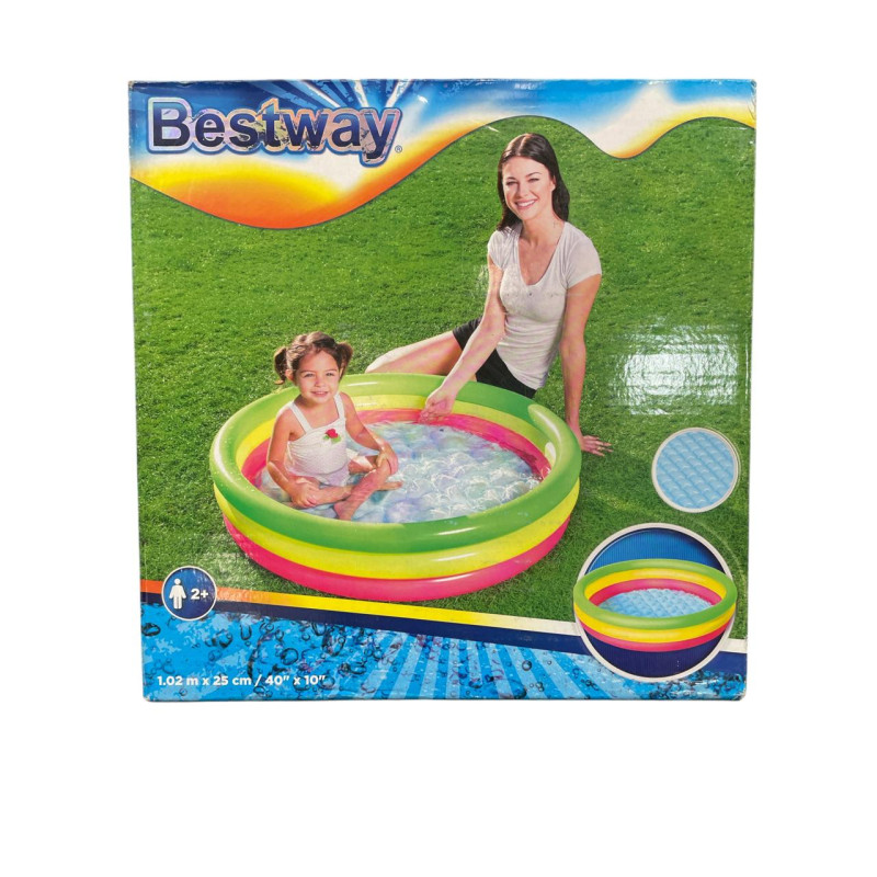 La piscina inflable BESTWAY modelo 51104 tiene un tamaño ideal de 1.02 m de diámetro por 25 cm de alto. Perfecta para niños pequeños, con anillos inflables suaves y base cómoda. Fácil de usar, transportar y guardar. Material resistente para mayor durabilidad durante el verano.